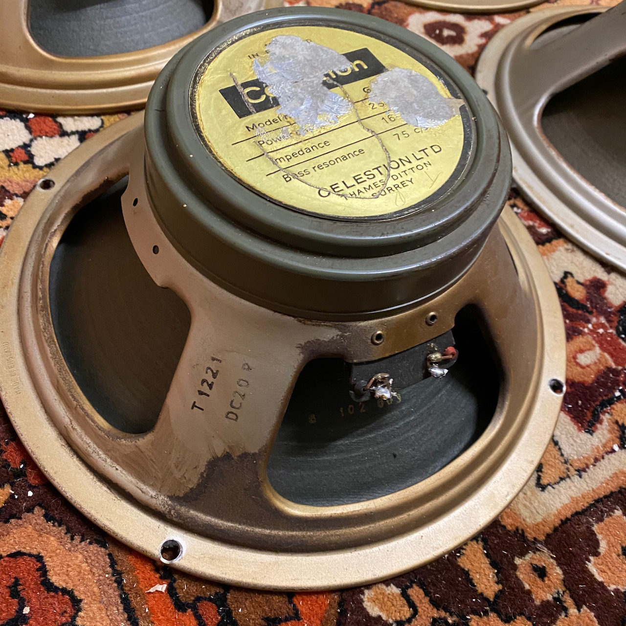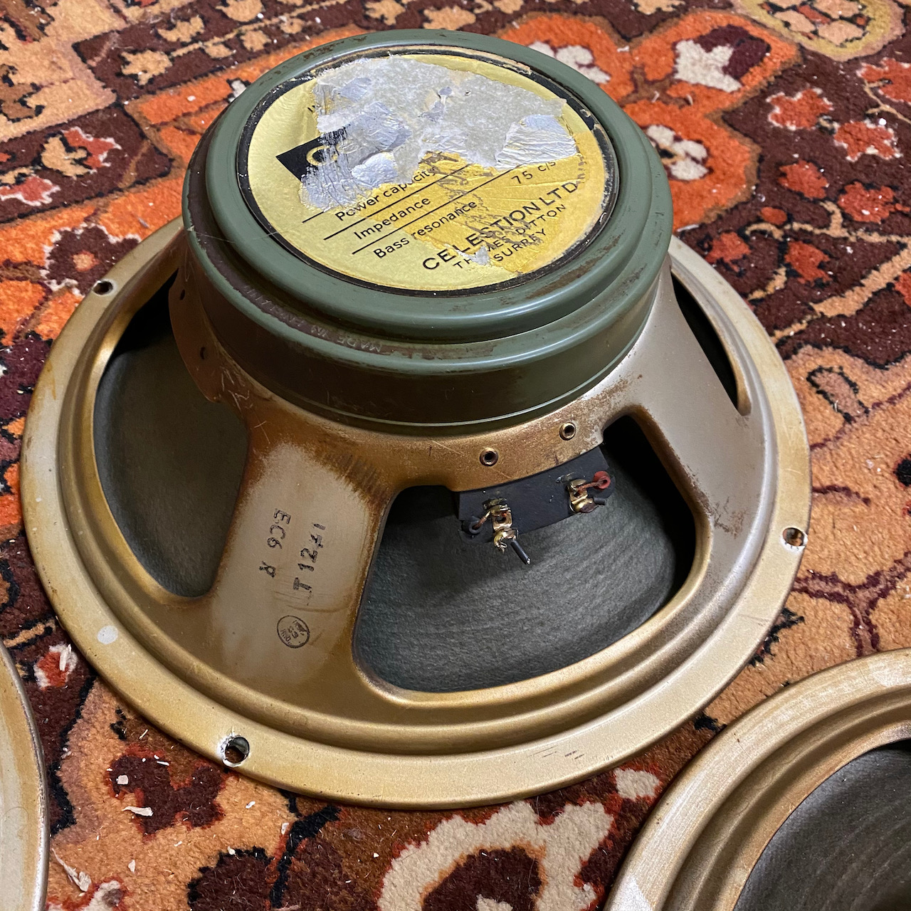 A brilliant quad of original Celestion G12M T1221 12″ speakers from April 1970. One is dated 27th April 1970, two 20th April 1970, and one 6th May 1970. They were taken from the same cabinets from new and they work great Original 003 cones in all four. Great sounding! The chassis are subject to many many years of tobacco in the club these sat in. I have tried to clean up as best I can, but with a bit more time and effort, they’ll clean up even better. Originally these had the black ‘Marshall’ logo stickers on, but the previous owner removed them leaving a few tears where the glue was as you can see. Wonderful speakers!